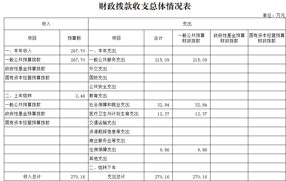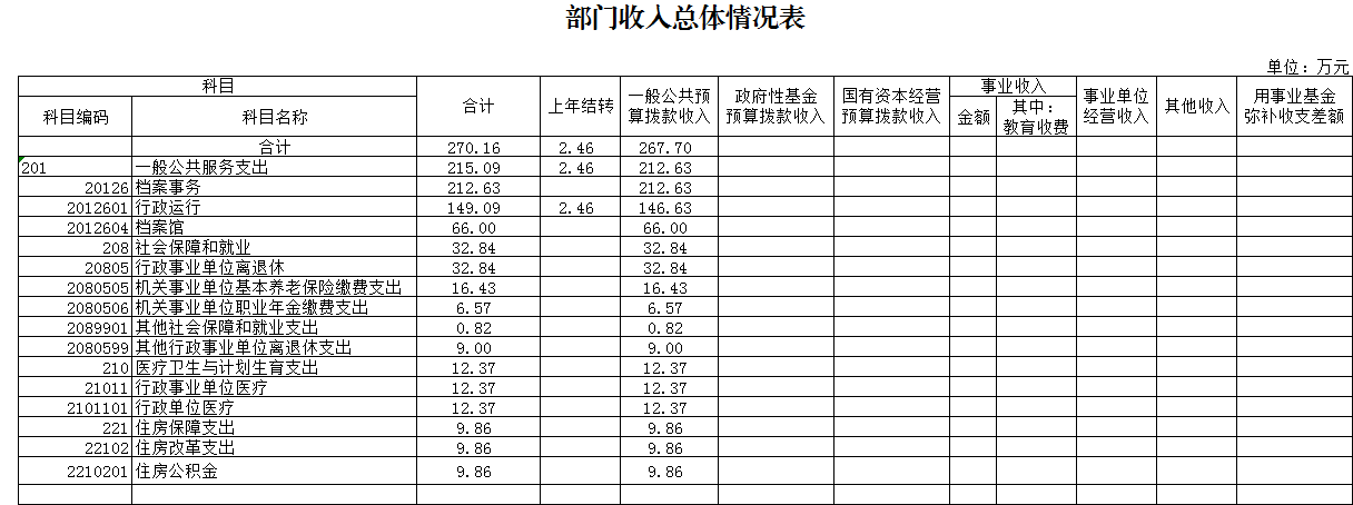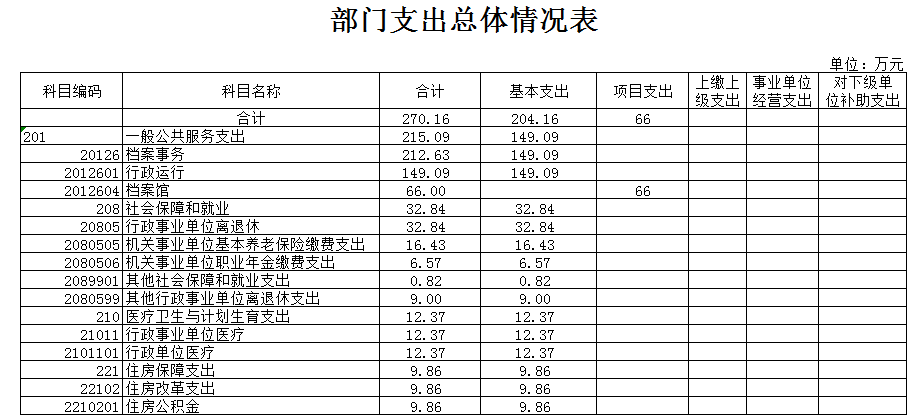 2018年一般公共預算財政撥款收入 267.70萬元,一般公共預算財政撥款支出 267.70  萬元,比2017年增加(或減少)43.20  萬元。其中:基本支出201.70萬元,比2017年增加(或減少)32.20萬元,主要原因是職人員工資福利及社會保險繳費,離退休人員離退休費及生活補助,保障部門正常運轉的各項商品服務支出;項目支出  66.00 萬元,比2017年增加(或減少)9.00  萬元,主要原因是增加檔案著錄費等重點工作。