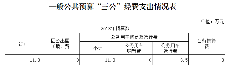2018年“三公”經費預算 11.5萬元,比2017年減少2.7 萬元。其中:因公出國(境)費用 0.00 萬元,比2017年減少0.00萬元;公務接待費  8.00萬元,比2017年減少 1.70萬元;公務用車運行維護費3.5萬元,比2017年減少 1.00 萬元;公務用車購置費   0.00萬元,比2017年減少0.00  萬元;主要原因是接待人數減少。