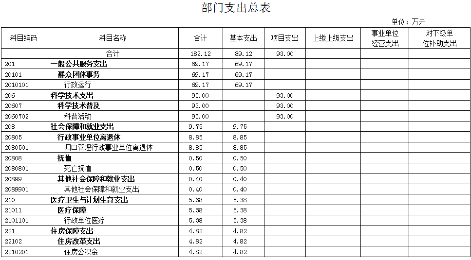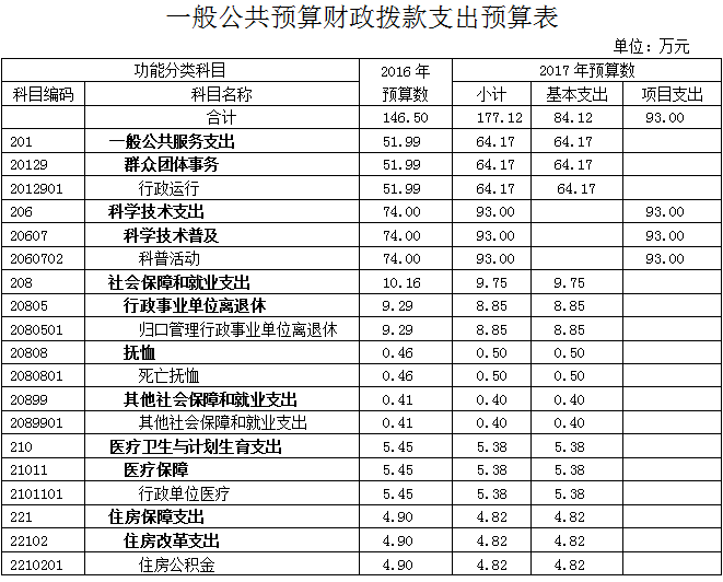 2017年本單位預算收入合計177.12萬元,其中:年初預算財政撥款177.12萬元(一般公共預算財政撥款177.12萬元)。加上上年結轉5.0萬元,可支配收入總計182.12萬元。本年支出合計182.12萬元。其中,財政預算撥款支出177.12萬元,按功能分類:一般公共服務支出69.17萬元,科學技術支出93萬元,社會保障和就業支出9.75萬元,醫療衛生和計劃生育支出5.38萬元,住房保障支出4.82萬元。公共預算財政撥款基本支出84.12萬元,按經濟分類:工資福利支出50.91萬元,商品和服務支出19.03萬元,對個人和家庭補助支出14.18萬元。財政預算撥款項目支出93萬元,主要用于院士專家工作站建設 、科學技術普及、青少年科技活動、創新驅動助力工程建設、企業數據信息推送、基層科普行動計劃項目儲備建設等。總預算收支與2016年相比,主要變化一是財政預算撥款增加30.62萬元,其原因是落實新《預算法》要求,上級轉移支付和縣級財政安排的項目資金提前下達單位,進一步加快項目建設實施和預算執行進度;二是今年新增實施院士專家工作站建設、創新驅動助力工程示范區建設、企業數據信息推送等工作專項經費增加。