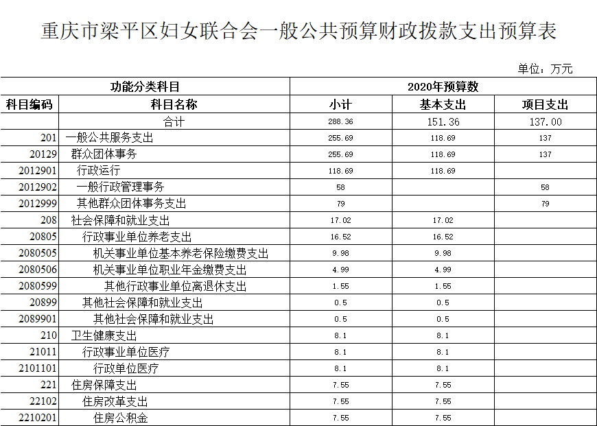 | 標題 | 重慶市梁平區(qū)婦女聯(lián)合會2020年部門預算情況說明 | ||