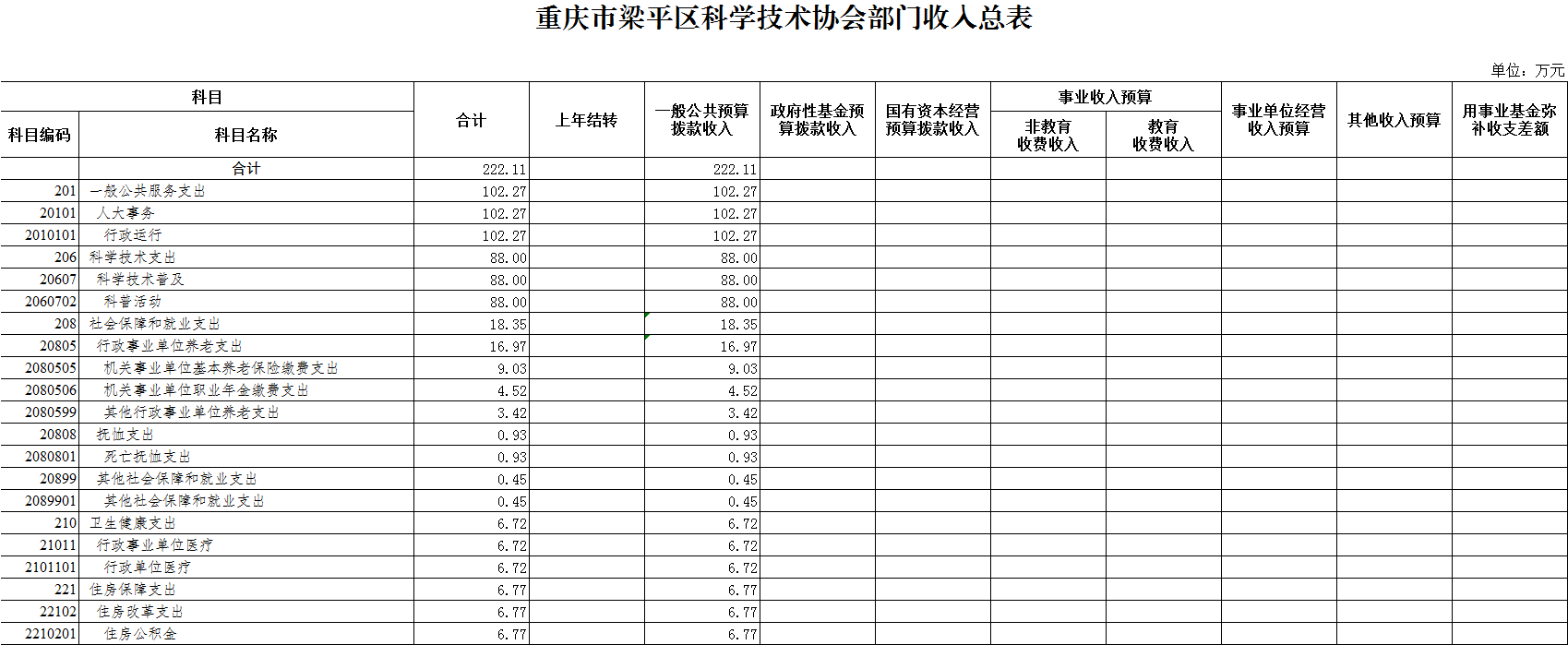 2020年一般公共預(yù)算財(cái)政撥款收入222.11萬元,一般公共預(yù)算財(cái)政撥款支出222.11萬元,比2019年增加25.22萬元。其中:基本支出134.11萬元,比2019年增加25.22萬元,主要原因是人員變動(dòng)等,主要用于保障本單位在職人員工資福利及社會(huì)保險(xiǎn)繳費(fèi),退休人員補(bǔ)助等,保障部門正常運(yùn)轉(zhuǎn)的各項(xiàng)商品服務(wù)支出;項(xiàng)目支出88萬元,比2019年增加0萬元,主要用于院士專家工作站建設(shè)、科學(xué)技術(shù)普及、青少年科技活動(dòng)、創(chuàng)新驅(qū)動(dòng)助力工程建設(shè)、企業(yè)數(shù)據(jù)信息推送、基層科普行動(dòng)計(jì)劃項(xiàng)目?jī)?chǔ)備建設(shè)、梁平科技館建設(shè)等。