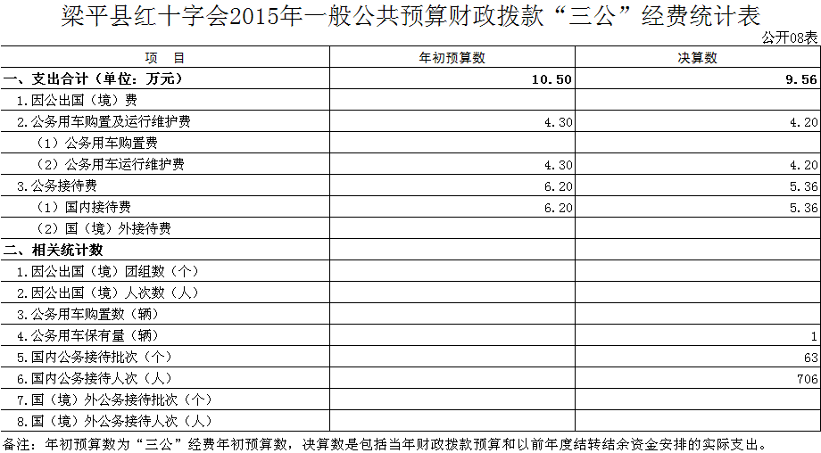 2015年梁平縣紅十字會“三公”經費決算數為9.56萬元,比年初預算數減少0.94萬元,主要原因是公務接待與公車運行維護支出降低。其中:?
