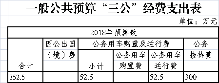 2018年“三公”經費預算352.5萬元,比2017年減少237.5萬元。其中:公務接待費300萬元,比2017年減少200萬元;公務用車運行維護費52.5萬元(其中機關本級2.5萬元,公務車輛管理服務中心50萬元),比2017年減少37.5萬元。變化主要原因是我單位嚴格執行八項規定等相關要求,厲行節約。按標準開展公務接待工作、公務用車運行工作。