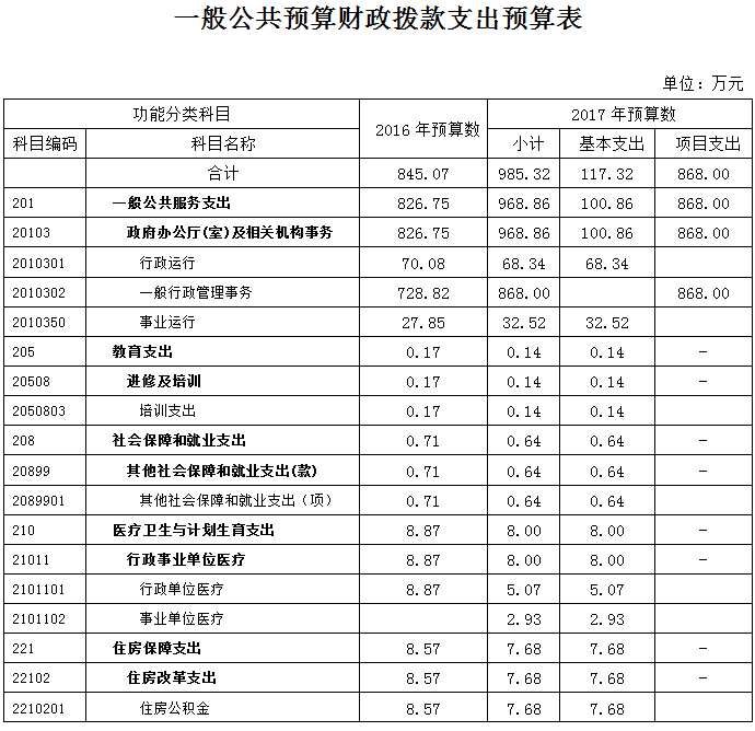 2017年一般公共預算財政撥款收入985.32萬元,一般公共預算財政撥款支出985.32萬元,比2016年增加140.25萬元。其中:基本支出117.32萬元,比2016年增加1.07萬元,主要原因是全區調整工資標準,主要用于保障在職人員工資福利及社會保險繳費;項目支出868.00萬元,比2016年增加139.18萬元,主要原因是新設立區車輛管理中心以及增加周轉房直飲水、公共機構節能項目,主要用于對重要公務、應急、遠距離等公務出行提供車輛保障服務,提供周轉房的飲水保障,有效地開展納入目標考核的公共機構節能工作等。