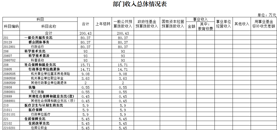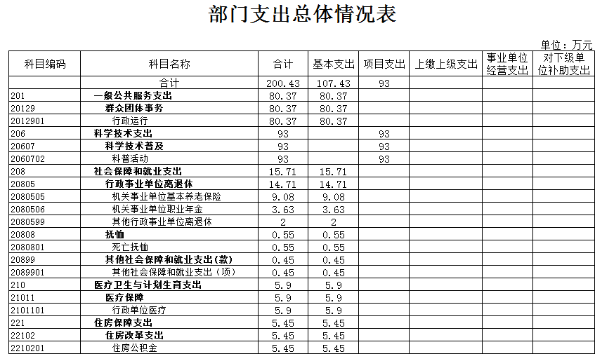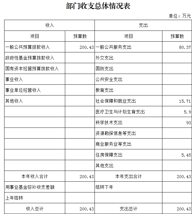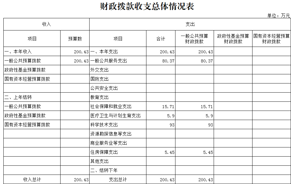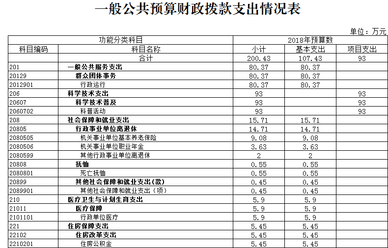 2018年本單位預(yù)算收入合計200.43萬元,其中:年初預(yù)算財政撥款200.43萬元(一般公共預(yù)算財政撥款200.43萬元)。,可支配收入總計200.43萬元。本年支出合計200.43萬元。其中,財政預(yù)算撥款支出200.43萬元,按功能分類:一般公共服務(wù)支出80.37萬元,科學技術(shù)支出93萬元,社會保障和就業(yè)支出15.71萬元,醫(yī)療衛(wèi)生和計劃生育支出5.9萬元,住房保障支出5.45萬元。公共預(yù)算財政撥款基本支出107.43萬元,按經(jīng)濟分類:工資福利支出85.44萬元,商品和服務(wù)支出19.43萬元,對個人和家庭補助支出2.56萬元。財政預(yù)算撥款項目支出93萬元,主要用于院士專家工作站建設(shè) 、科學技術(shù)普及、青少年科技活動、創(chuàng)新驅(qū)動助力工程建設(shè)、企業(yè)數(shù)據(jù)信息推送、基層科普行動計劃項目儲備建設(shè)等。總預(yù)算收支與2017年相比,主要變化一是財政預(yù)算撥款增加23.31萬元,其原因是落實新《預(yù)算法》要求,上級轉(zhuǎn)移支付和縣級財政安排的項目資金提前下達單位,進一步加快項目建設(shè)實施和預(yù)算執(zhí)行進度;二是今年新增實施院士專家工作站建設(shè)、創(chuàng)新驅(qū)動助力工程示范區(qū)建設(shè)、企業(yè)數(shù)據(jù)信息推送等工作專項經(jīng)費增加。