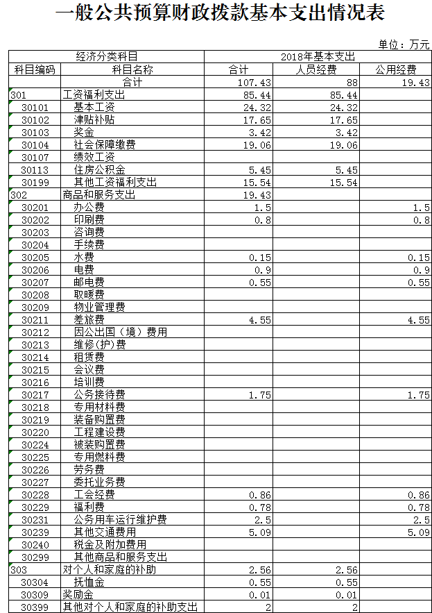 1、部門運行經(jīng)費(即公用經(jīng)費)。2018年一般公共預(yù)算財政撥款運行經(jīng)費19.43萬元,主要用于:辦公費及印刷費、郵電費、水電費、差旅費、公車運行維護費、其他交通費用、其他商品和服務(wù)支出。