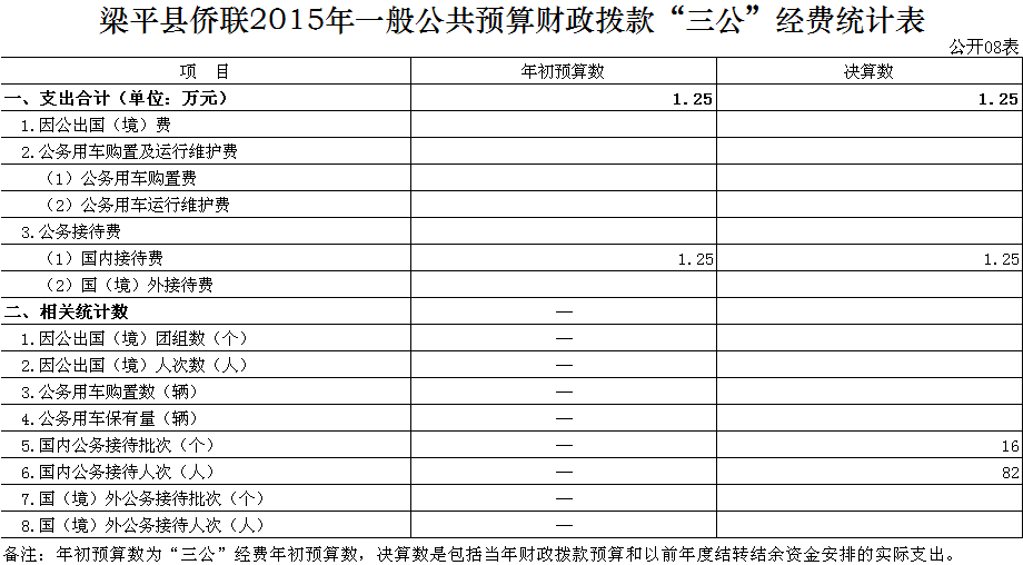 2015年梁平縣僑聯“三公”經費決算數為1.25萬元,與上年決算數相同。與年初預算數相同。其中: