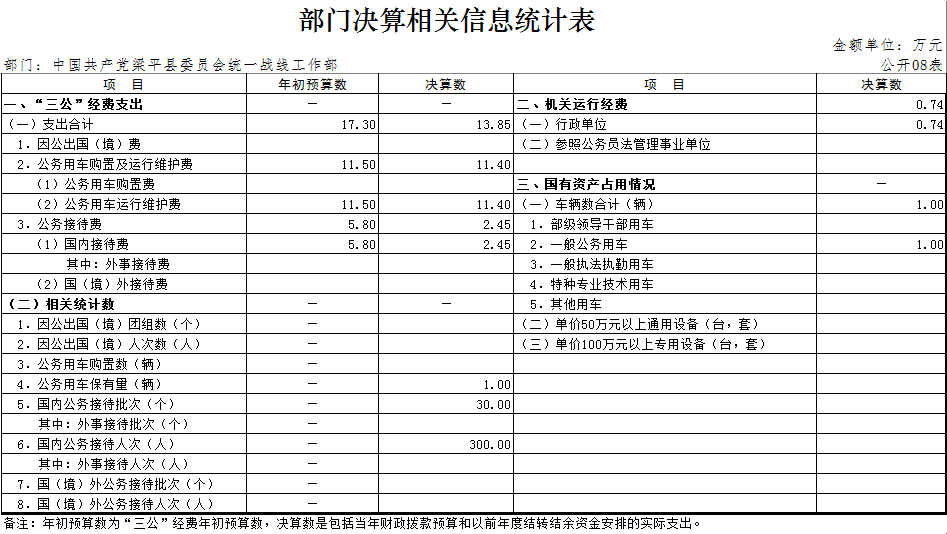 (十二)“三公”經(jīng)費(fèi):指用一般公共預(yù)算財(cái)政撥款安排的因公出國(境)費(fèi)、公務(wù)用車購置及運(yùn)行維護(hù)費(fèi)、公務(wù)接待費(fèi)。其中,因公出國(境)費(fèi)反映單位公務(wù)出國(境)的國際旅費(fèi)、國外城市間交通費(fèi)、住宿費(fèi)、伙食費(fèi)、培訓(xùn)費(fèi)、公雜費(fèi)等支出;公務(wù)用車購置費(fèi)反映單位公務(wù)用車購置支出(含車輛購置稅);公務(wù)用車運(yùn)行維護(hù)費(fèi)反映單位按規(guī)定保留的公務(wù)用車燃料費(fèi)、維修費(fèi)、過路過橋費(fèi)、保險(xiǎn)費(fèi)、安全獎(jiǎng)勵(lì)費(fèi)用等支出;公務(wù)接待費(fèi)反映單位按規(guī)定開支的各類公務(wù)接待(含外賓接待)支出。