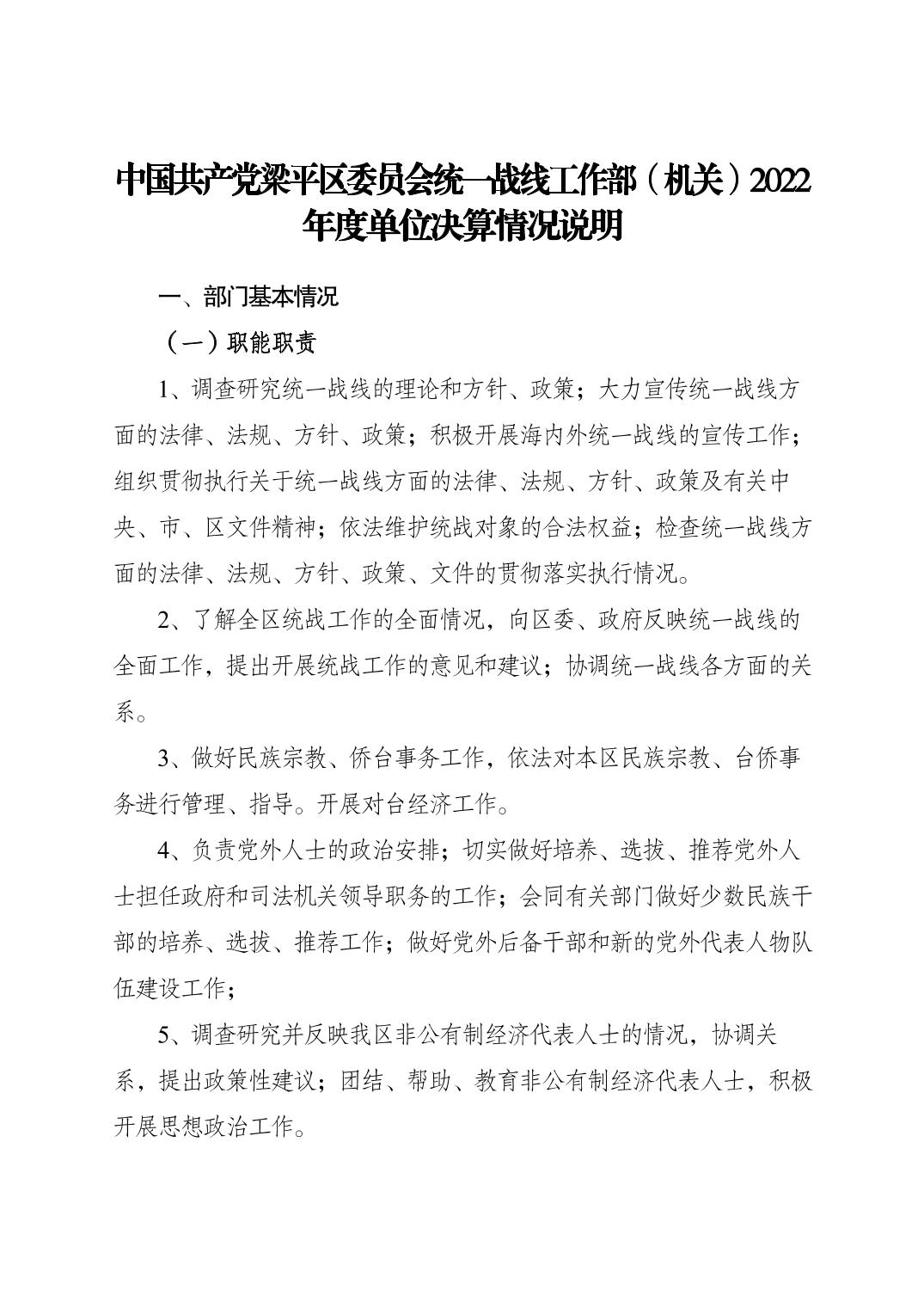 標題 中國共產(chǎn)黨梁平區(qū)委員會統(tǒng)一戰(zhàn)線工作部(機關(guān))2022年度單位決算情況說明
