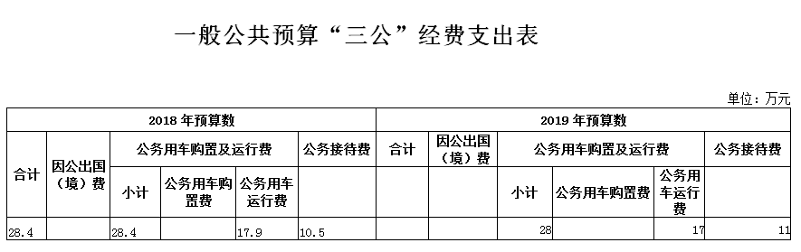 2019年“三公”經費預算28萬元,比2018年減少 0.4萬元。其中:因公出國(境)費用0萬元,比2018年增加0萬元,主要原因是無因公出國(境)活動;公務接待費11萬元,比2018年增加0.5萬元,主要原因是接受市級專項督察較多,公務接待費有所增加;公務用車運行維護費17萬元,比2018年減少0.9萬元,主要原因是我單位嚴格落實中央八項規定精神、《黨政機關厲行節約反對浪費條例》和市、區關于厲行節約的各項規定,繼續從嚴從緊控制公務用車運行維護經費支出;公務用車購置費0萬元,比2018年增加0萬元,主要原因是無公務用車購置。