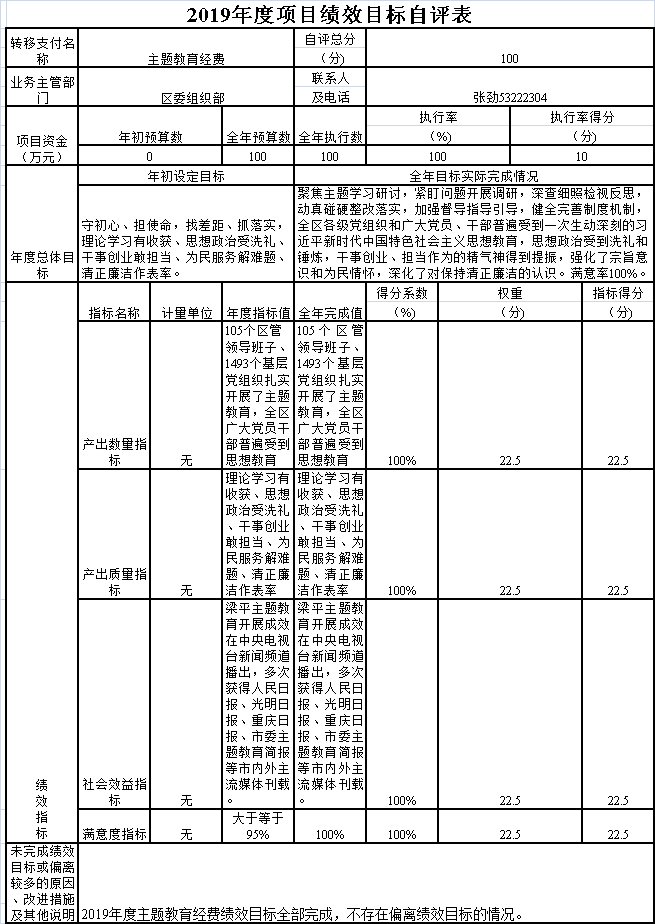 “不忘初心、牢記使命”主題教育經費項目績效目標自評綜述:根據年初設定的績效目標,項目總體完成情況:聚焦主題學習研討,緊盯問題開展調研,深查細照檢視反思,動真碰硬整改落實,加強督導指導引導,健全完善制度機制,全區各級黨組織和廣大黨員、干部普遍受到一次生動深刻的習近平新時代中國特色社會主義思想教育,思想政治受到洗禮和錘煉,干事創業、擔當作為的精氣神得到提振,強化了宗旨意識和為民情懷,深化了對保持清正廉潔的認識。項目全年預算數為100萬元,執行數為100萬元,完成預算的100.0%。主要產出和效果:一是105個區管領導班子、1493個基層黨組織扎實開展了主題教育,全區廣大黨員干部普遍受到思想教育。二是理論學習有收獲、思想政治受洗禮、干事創業敢擔當、為民服務解難題、清正廉潔作表率。三是梁平主題教育開展成效在中央電視臺新聞頻道播出,多次獲得人民日報、光明日報、重慶日報、市委主題教育簡報等市內外主流媒體刊載。發現的問題及原因:一是有的黨員干部理論學習不夠深透、不系統,在學用結合上有差距。二是一些深層次矛盾和問題還沒有從根本上破解。三是有的基層黨組織建設還比較薄弱。下一步改進措施:一是抓緊扎實永恒課題、終身課題,始終保持共產黨人的政治本色和前進動力。二是持續強化理論武裝,在學懂弄通做實習近平新時代中國特色社會主義思想上下更大功夫。三是更加注重干事創業,把初心使命落實在崗位上、體現在行動中。四是切實履行管黨治黨政治責任,推動全面從嚴治黨向縱深發展。五是加大制度建設,不斷鞏固拓展主題教育成果。六是充分發揮領導機關和領導干部帶頭作用,以實干實績開創各項事業發展新局面。