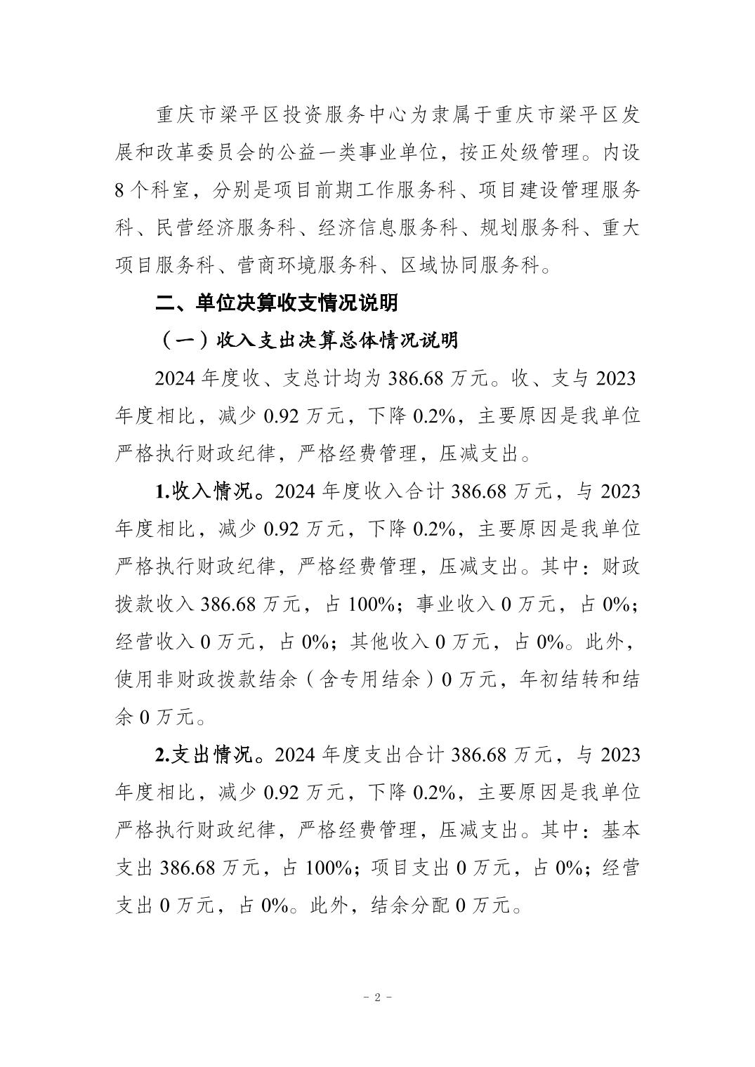 | 標(biāo)題 | 重慶市梁平區(qū)投資服務(wù)中心2024年度決算公開(kāi)說(shuō)明及報(bào)表 |