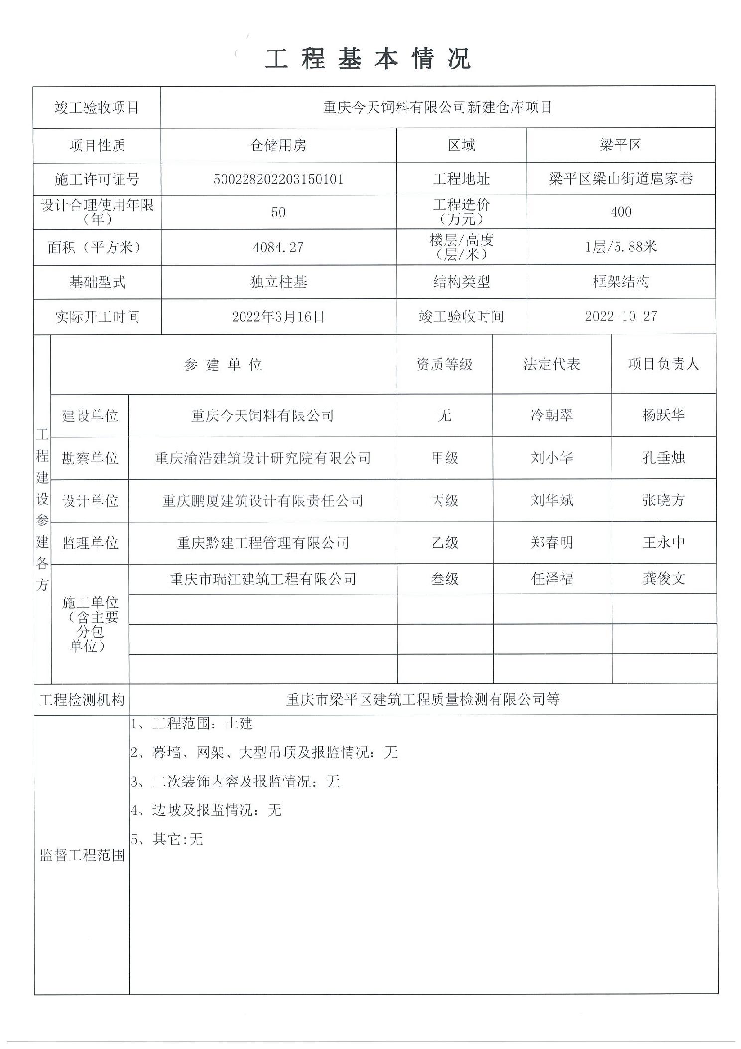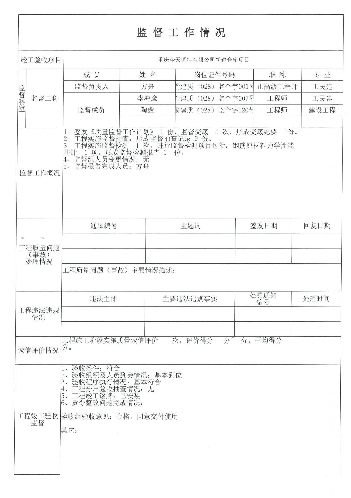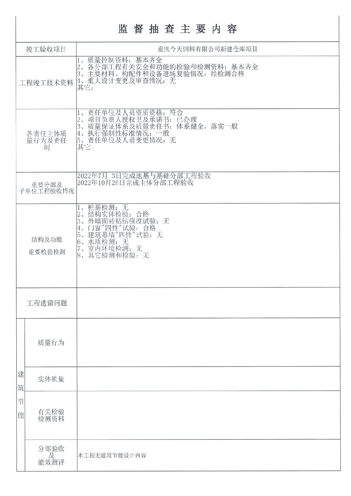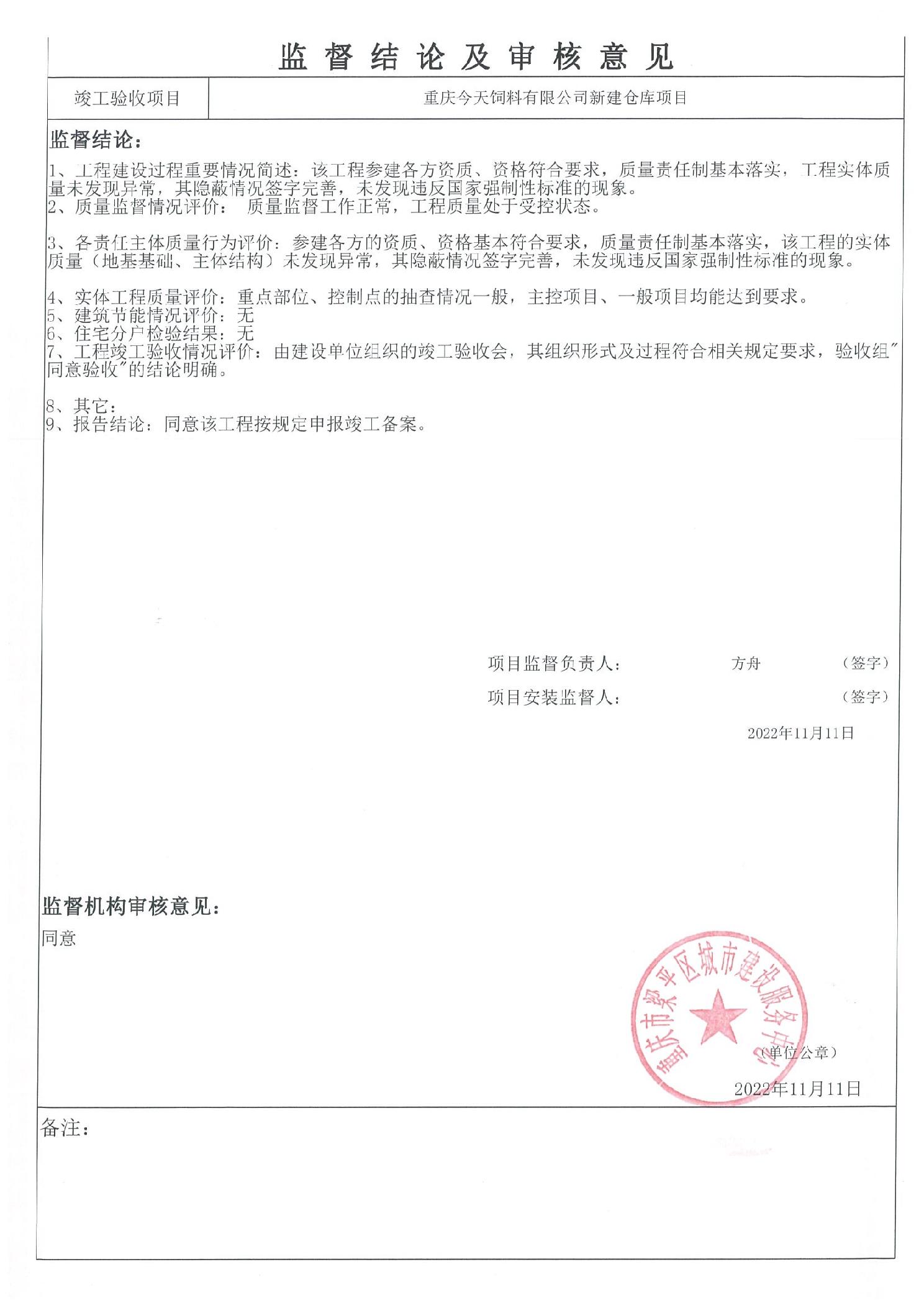 | 標題 | 重慶今天飼料有限公司新建倉庫項目監督報告 |