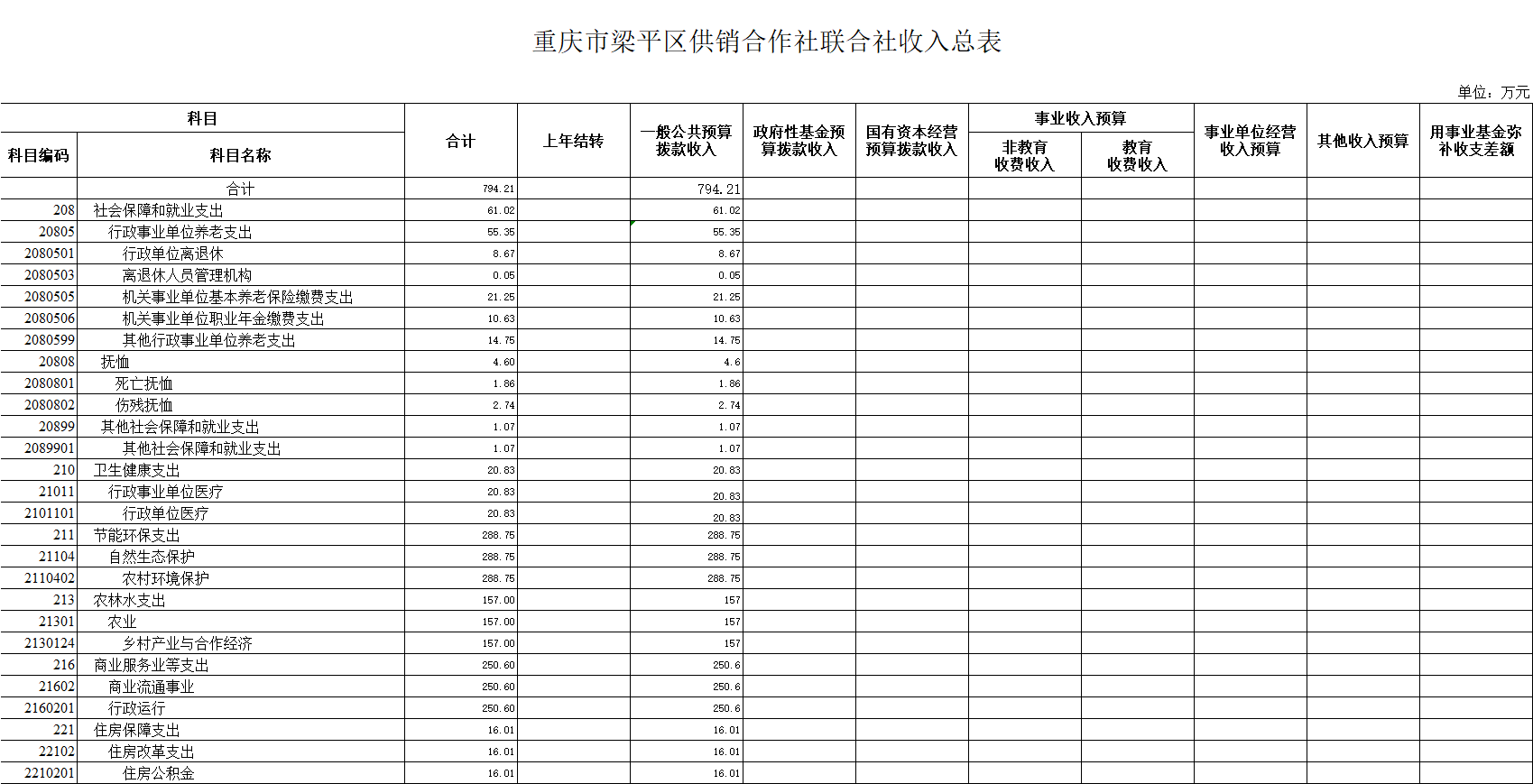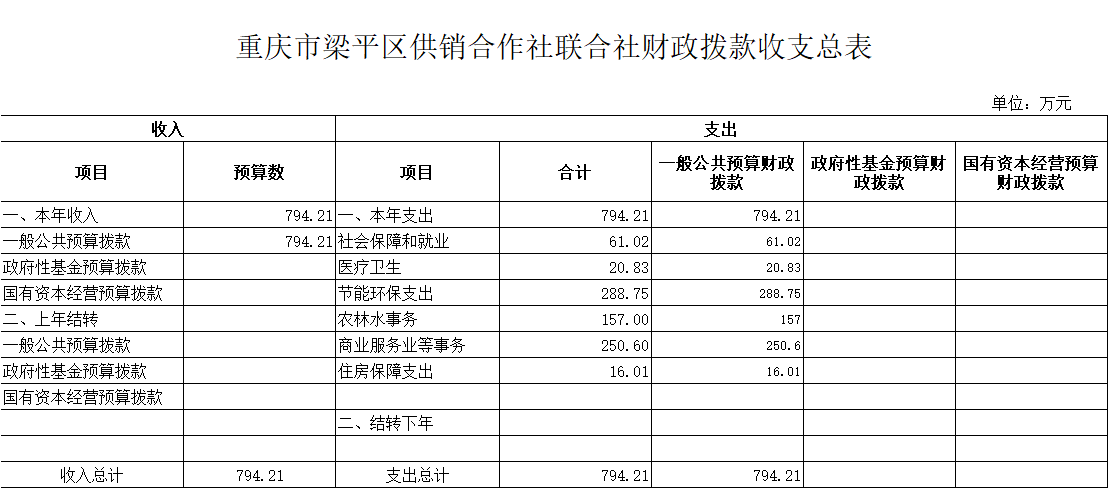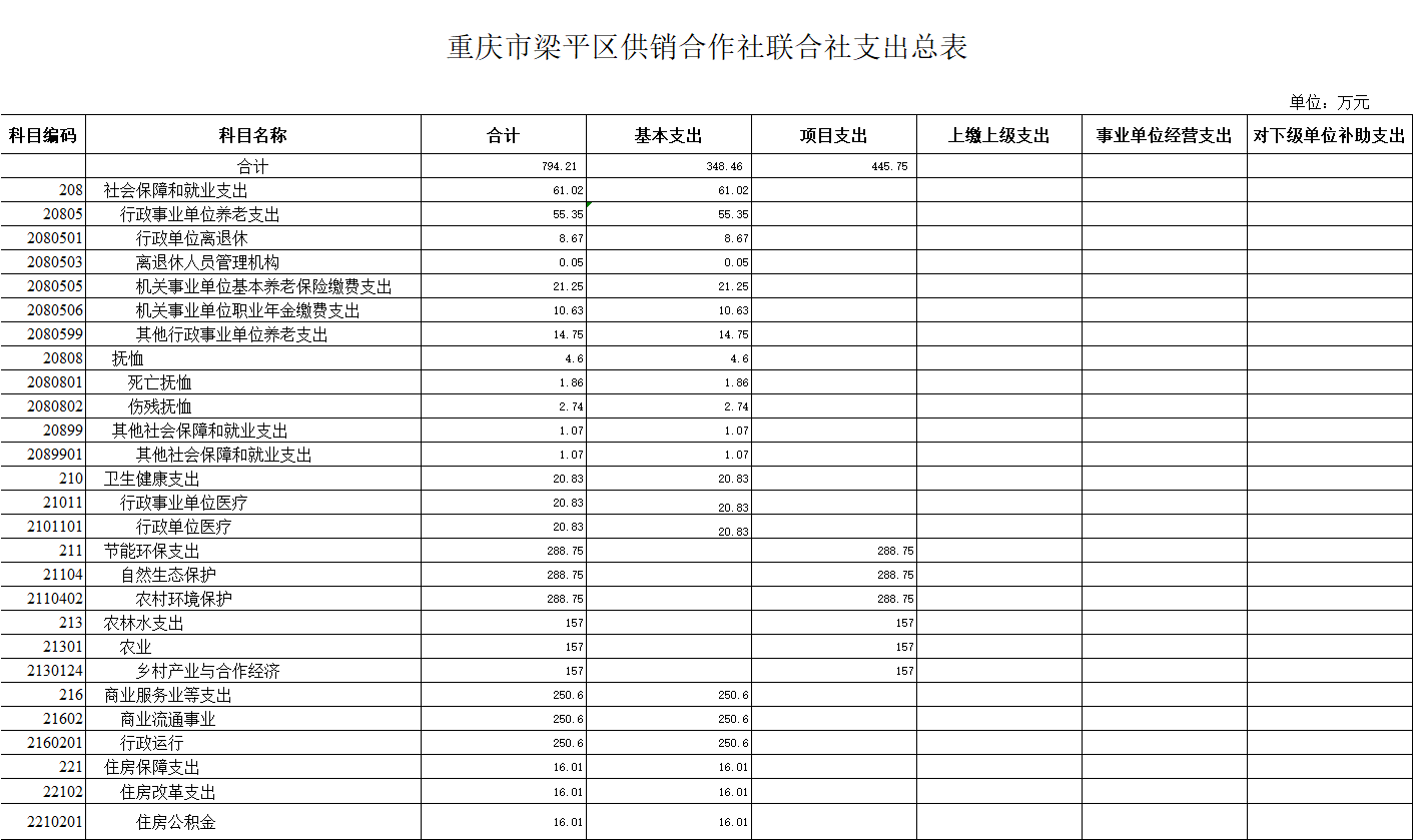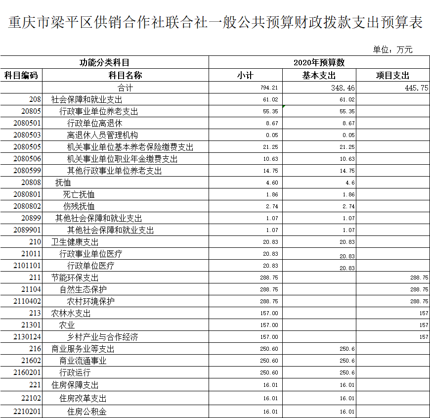 2020年一般公共預算財政撥款收入794.21萬元,一般公共預算財政撥款支出794.21萬元,比2019年增加 103.97萬元。其中:基本支出348.46萬元,比2019年減少31.78萬元,主要原因一是區社一名職工退休,二是公用經費標準進一步調低。主要用于保障梁平區供銷合作社聯合社在職人員工資福利及社會保險繳費,離休人員離休費,退休人員補助等,保障部門正常運轉的各項商品服務支出;項目支出445.75萬元,比2019年增加103.97萬元,主要原因:根據區政府統安排的“兩社兩化”發展專項資金,統一調整為100萬元,比2019年增加5萬元,增加了5%。根據市供銷社安排,增加農村環境保護項目資金288.75萬元。