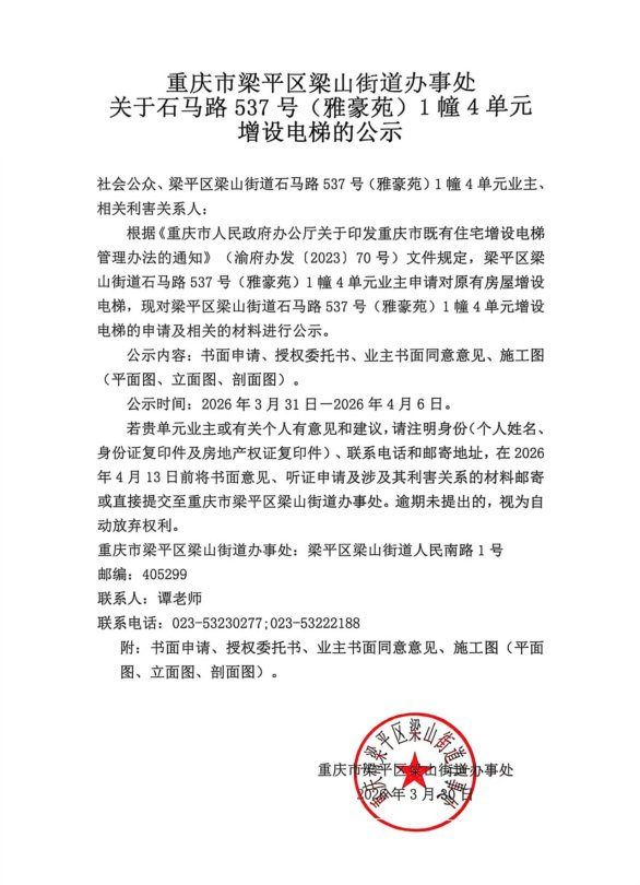 | 標題 | 重慶市梁平區(qū)梁山街道辦事處關于石馬路537號(雅豪苑)1幢4單元增設電梯的公示 |