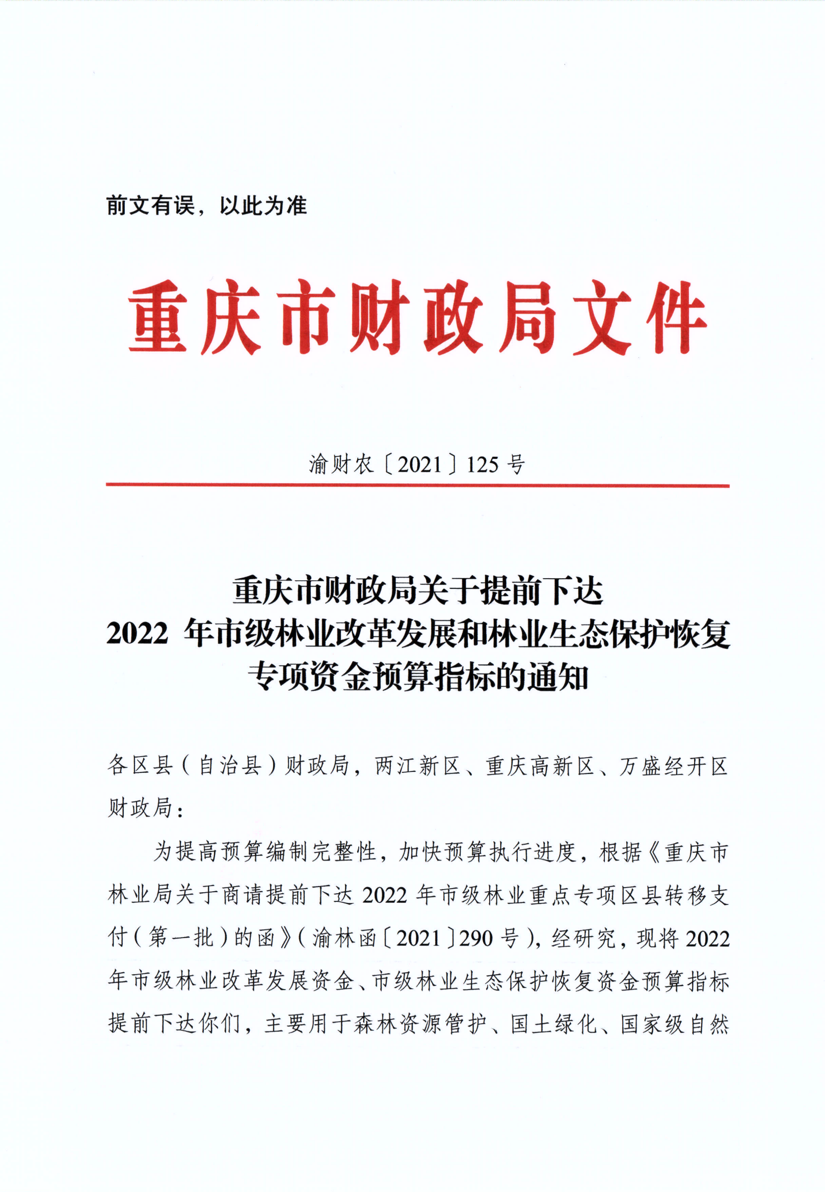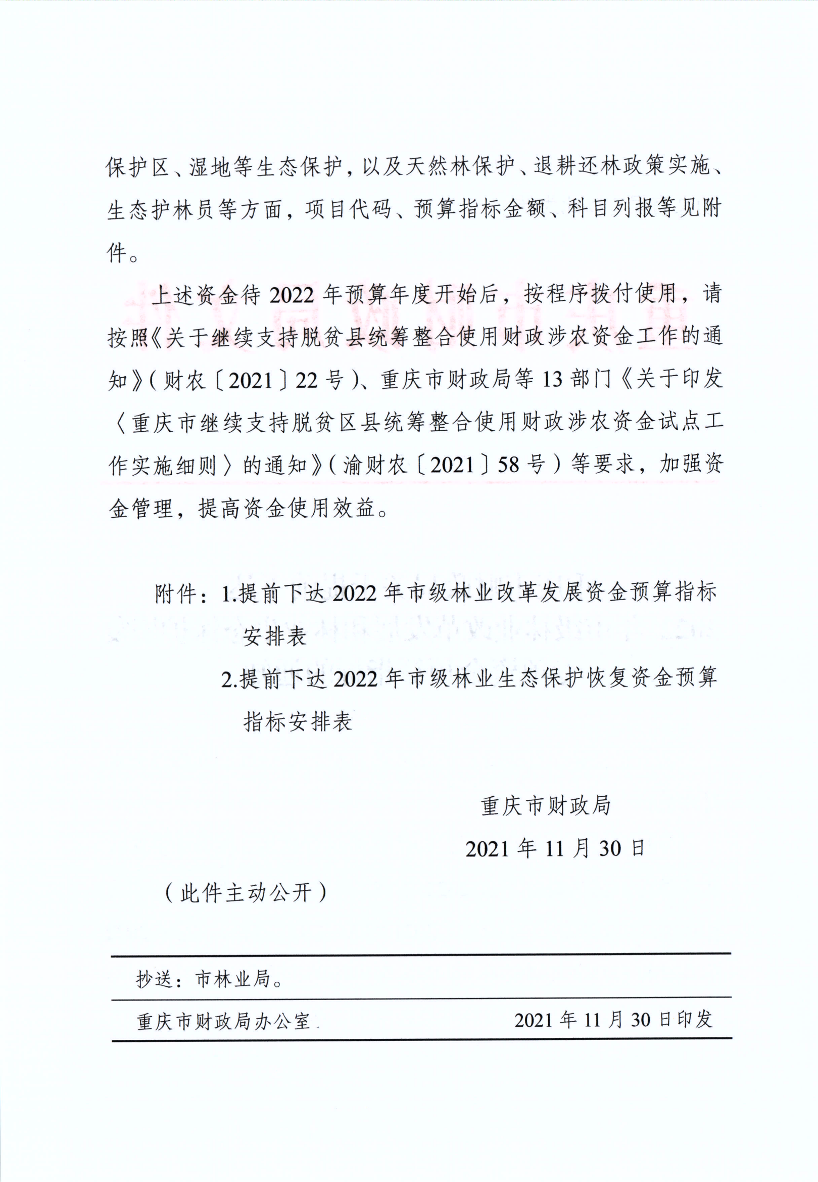 重慶市財(cái)政局關(guān)于提前下達(dá)2022年市級(jí)林業(yè)改革發(fā)展和林業(yè)生態(tài)保護(hù)恢復(fù)專項(xiàng)資金預(yù)算指標(biāo)的通知