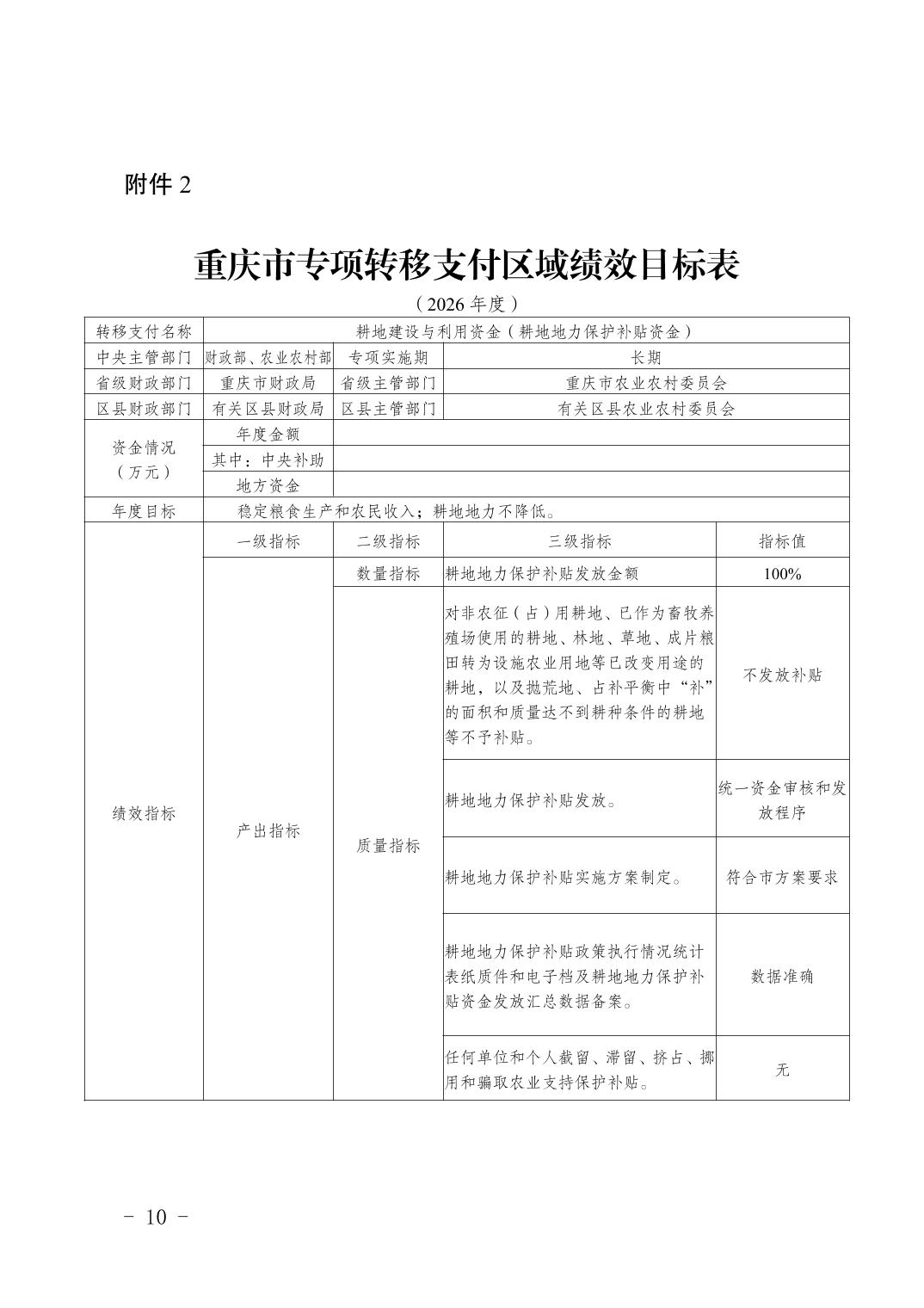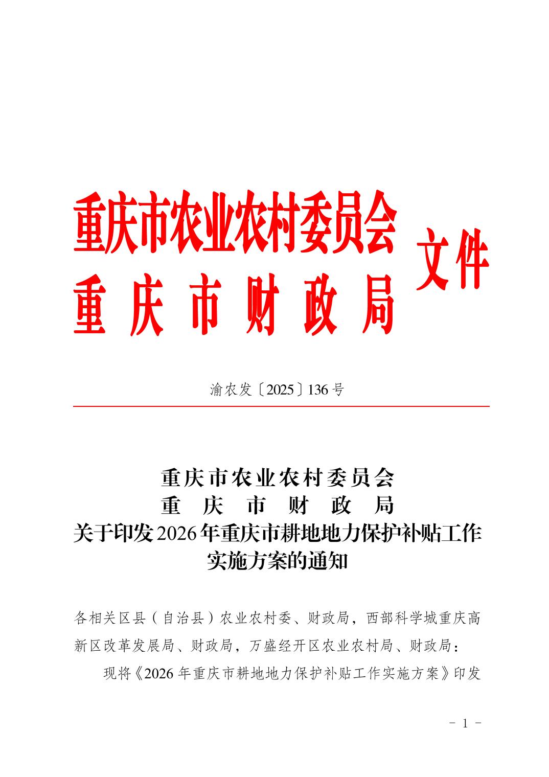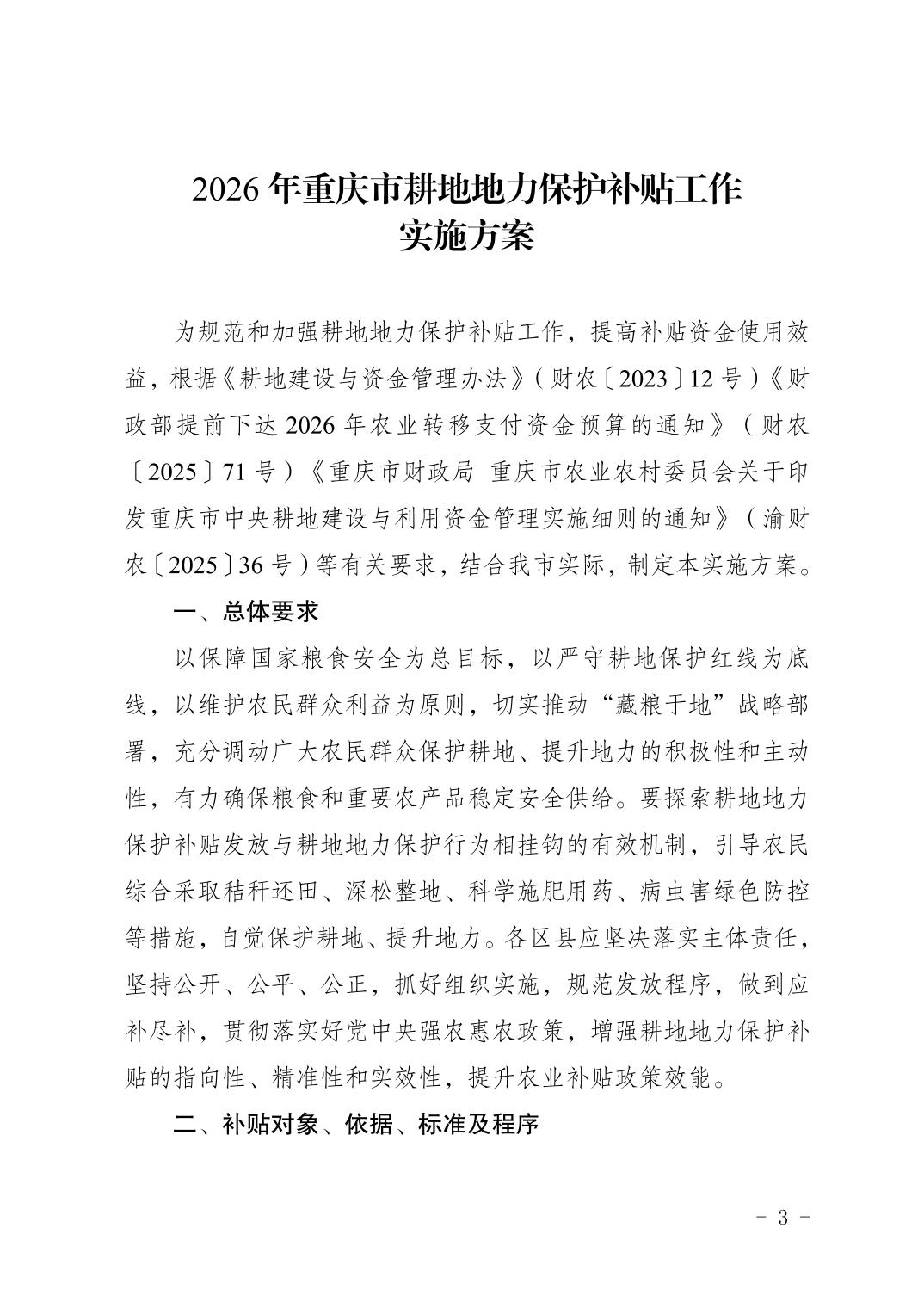 | 標題 | 重慶市農業農村委員會關于印發2026年重慶市耕地地力保護補貼工作實施方案的通知 |