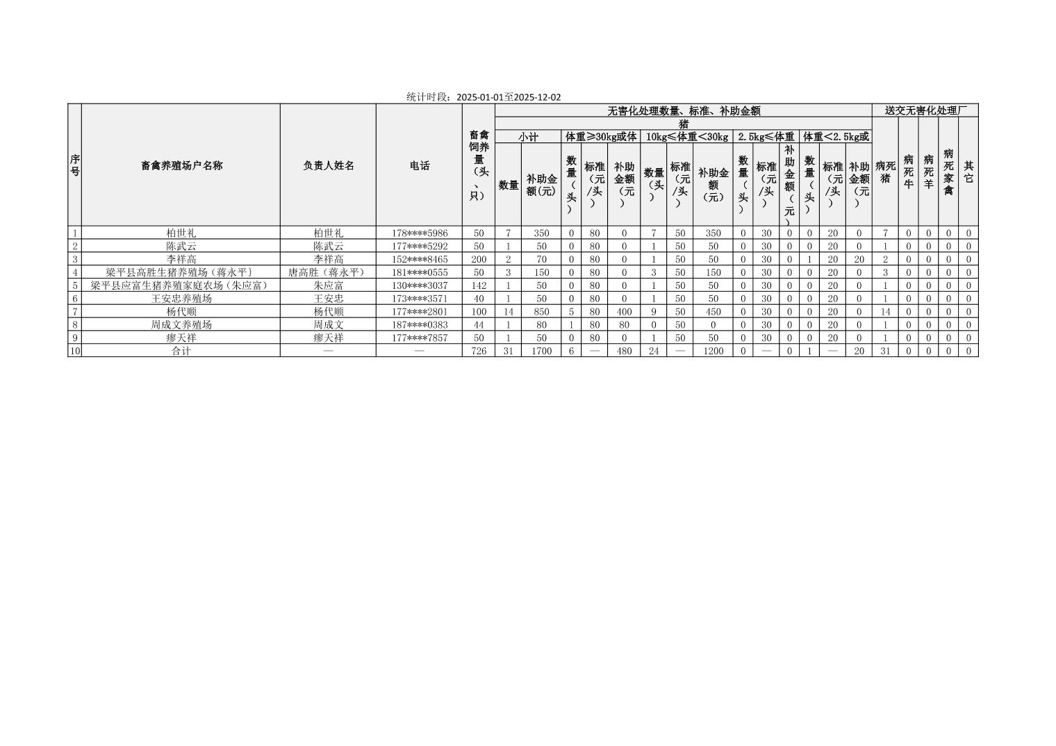 | 標(biāo)題 | 重慶市梁平區(qū)蟠龍鎮(zhèn)養(yǎng)殖環(huán)節(jié)病死畜禽無害化處理情況統(tǒng)計(jì)表(2025年) |