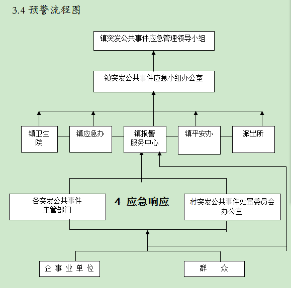 3.2.4突發公共事件發生地所在村(社區)應在第一時間成立應急響應隊伍并組織實施先期應急搶險工作,控制事態進一步發展。鎮應急辦得到預警信息后,立即啟動相應的應急預案進行處置。