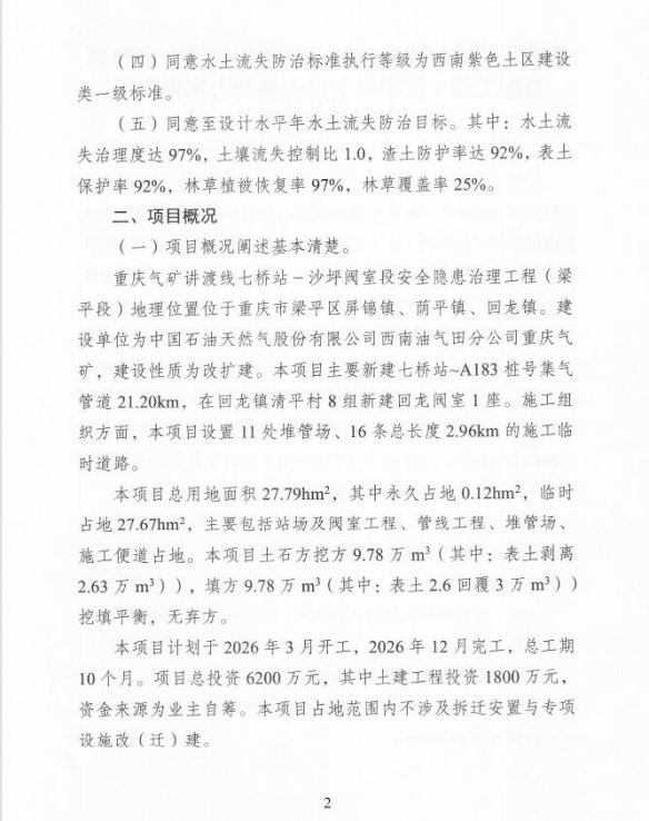 你單位提交的重慶氣礦講渡線七橋站-沙坪閥室段安全隱患治理工程(梁平段)水土保持方案審批申請(項目代碼:2510-500155-04-01-839260)和《重慶氣礦講渡線七橋站-沙坪閥室段安全隱患治理工程(梁平段)水土保持方案報告書》收悉。經(jīng)審查,該申請符合法定條件,根據(jù)《中華人民共和國行政許可法》第三十八條第一款、《水行政許可實(shí)施辦法》第三十二條第一項規(guī)定,決定準(zhǔn)予行政許可。