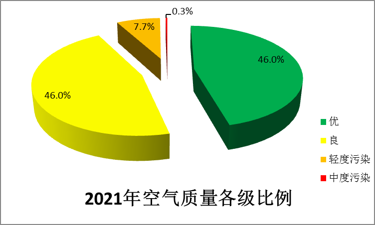 2021年空氣質量日報統計表明:梁平城區空氣質量優的天數為168天,占總天數的46.0%,良的天數為168天,占總天數的46.0%,輕度污染的天數為28天,占總天數的7.7%,中度污染的天數為1天,占總天數的0.3%,全年無重度污染。