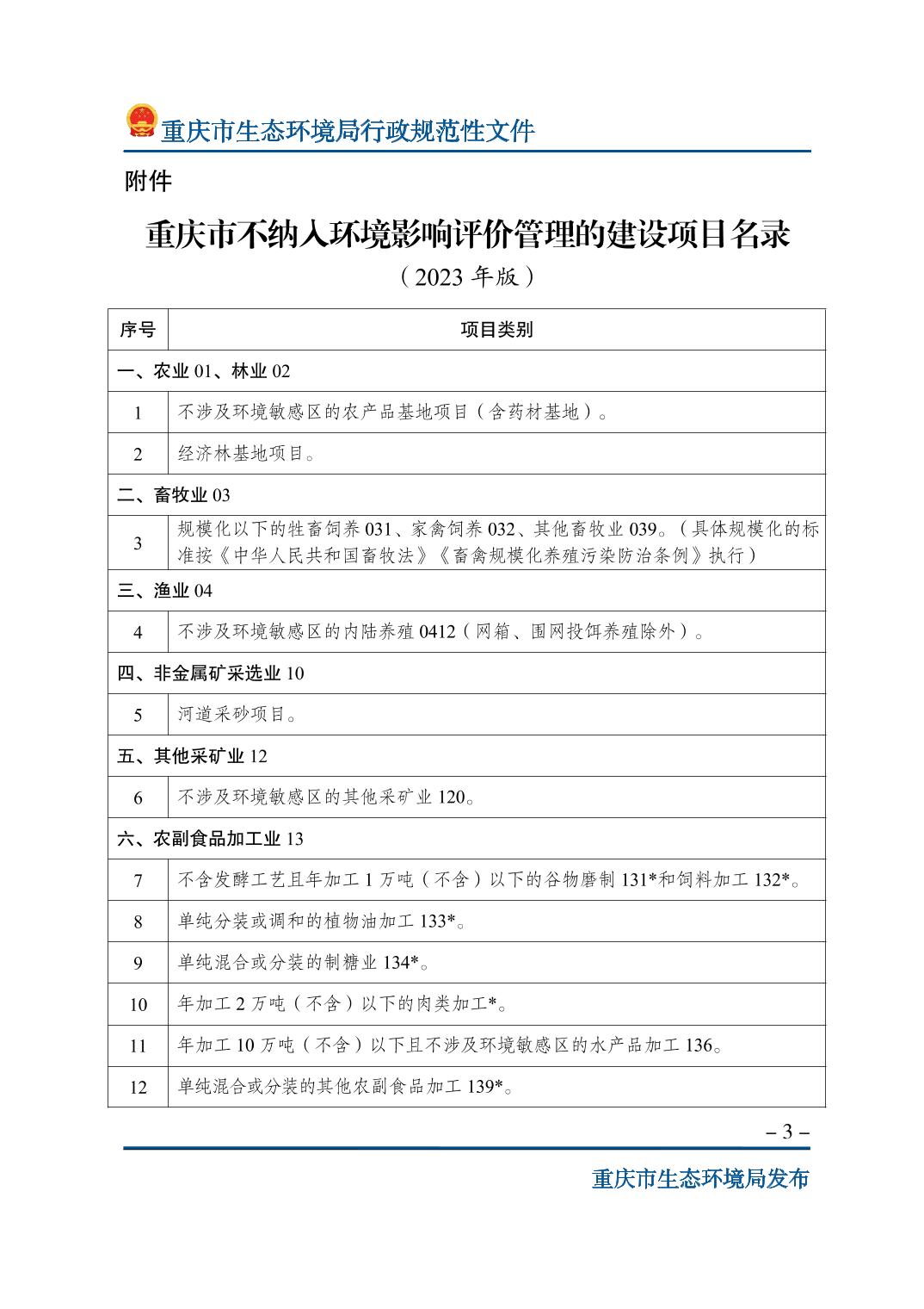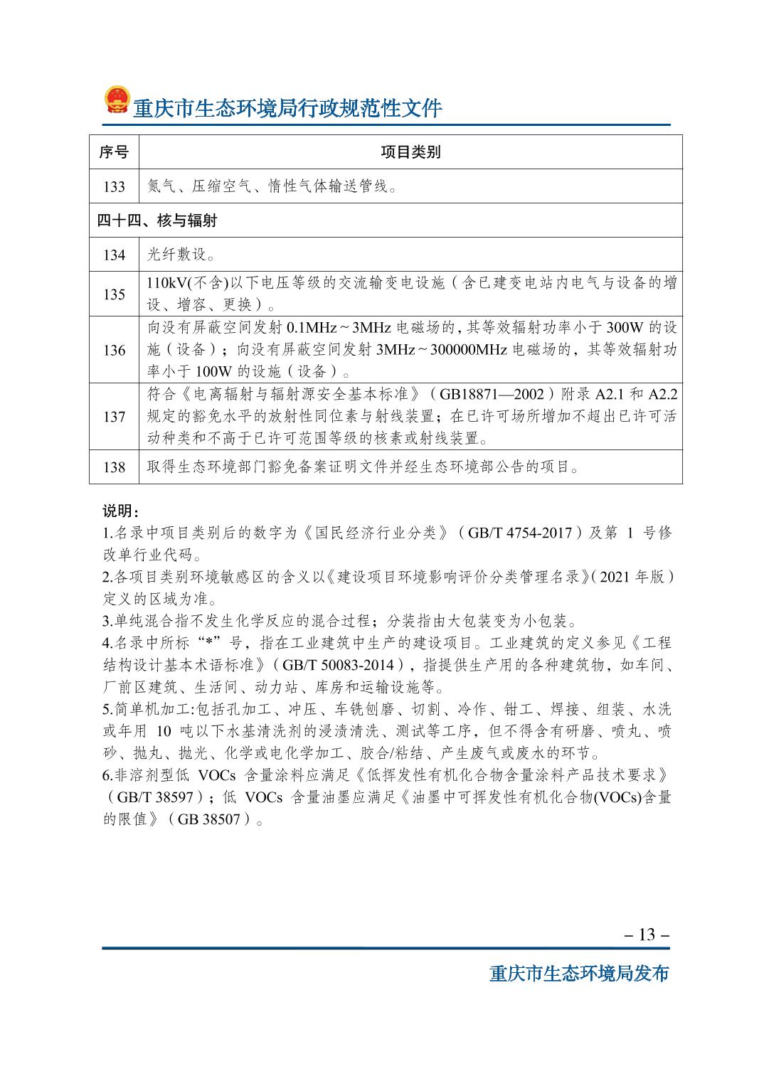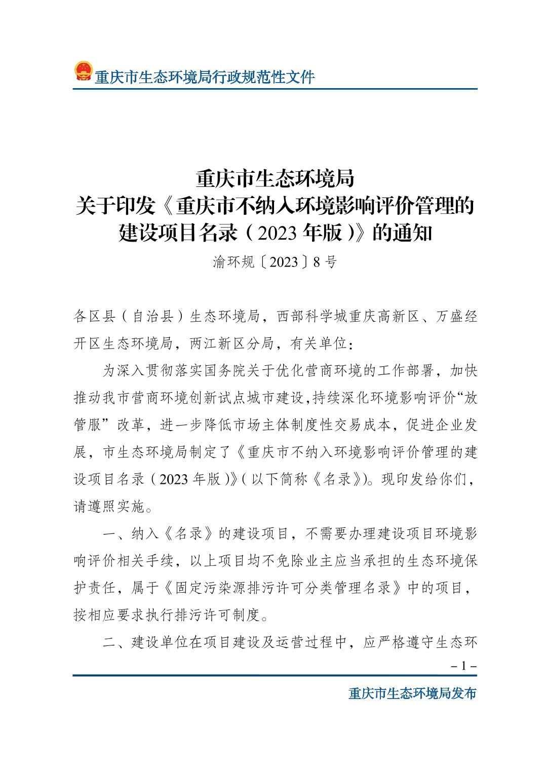 | 標(biāo)題 | 重慶市生態(tài)環(huán)境局關(guān)于印發(fā)《重慶市不納入環(huán)境影響評(píng)價(jià)管理的建設(shè)項(xiàng)目名錄(2023年版)》的通知 | ||