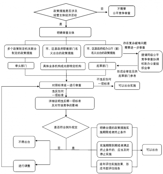 第九條? 政策制定機關開展公平競爭審查應當遵循審查基本流程(可參考附件1),識別相關政策措施是否屬于審查對象、判斷是否違反審查標準、分析是否適用例外規定等。屬于審查對象的,經審查后應當在《公平競爭審查表》(可參考附件2)中形成明確的書面審查結論。
