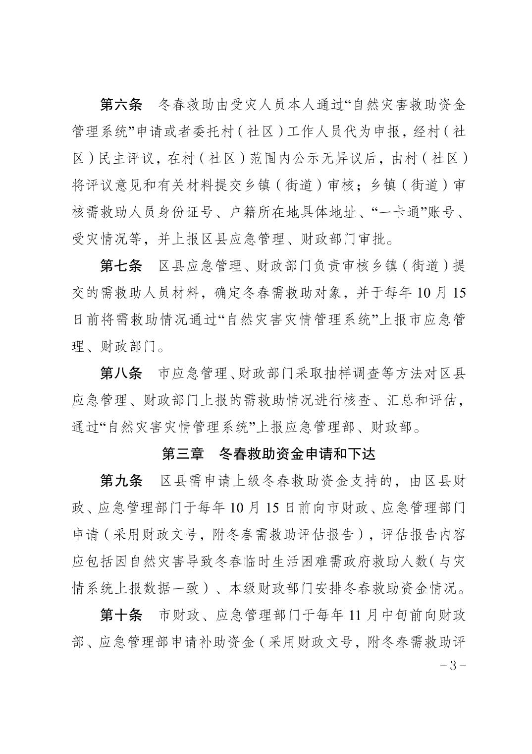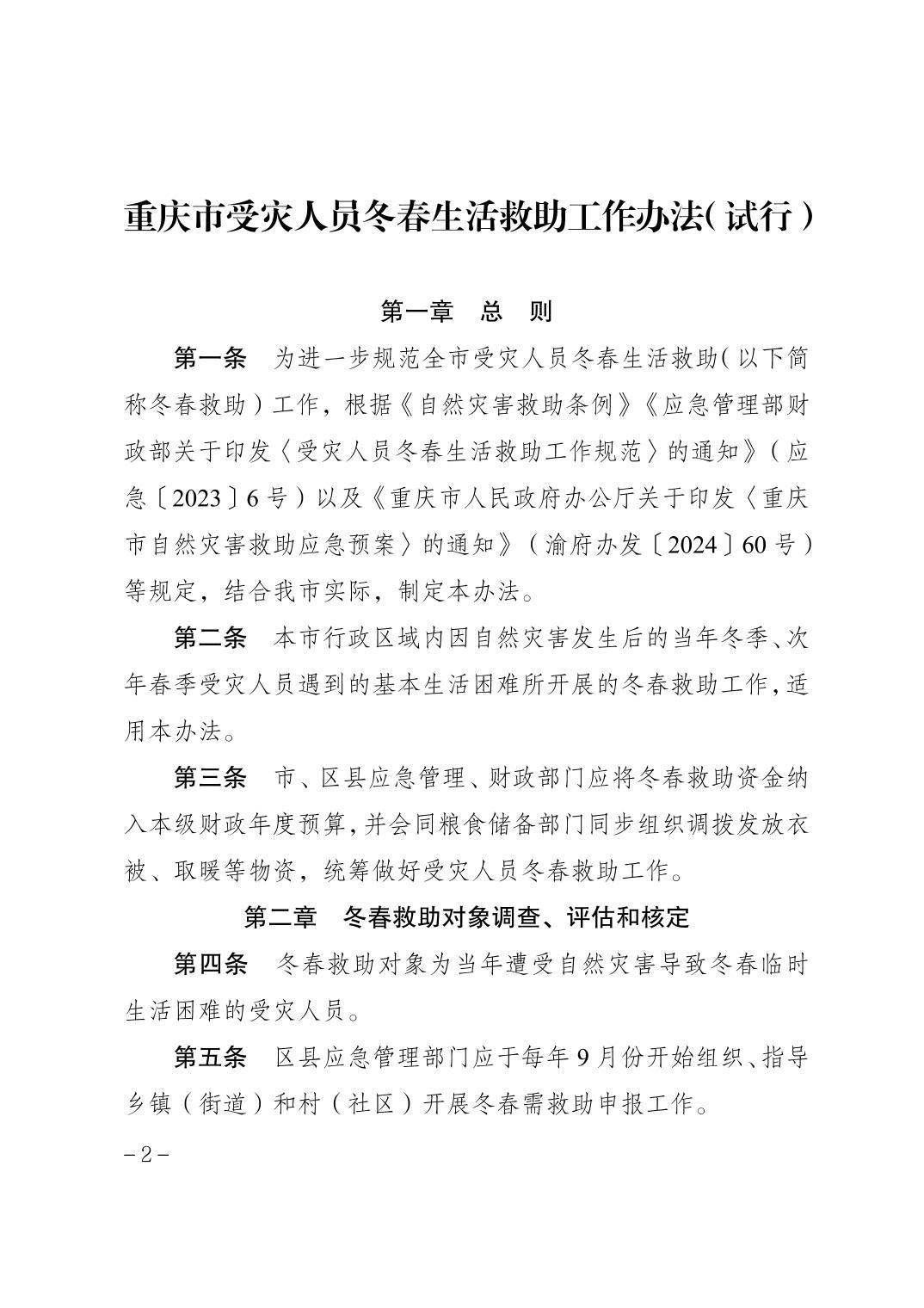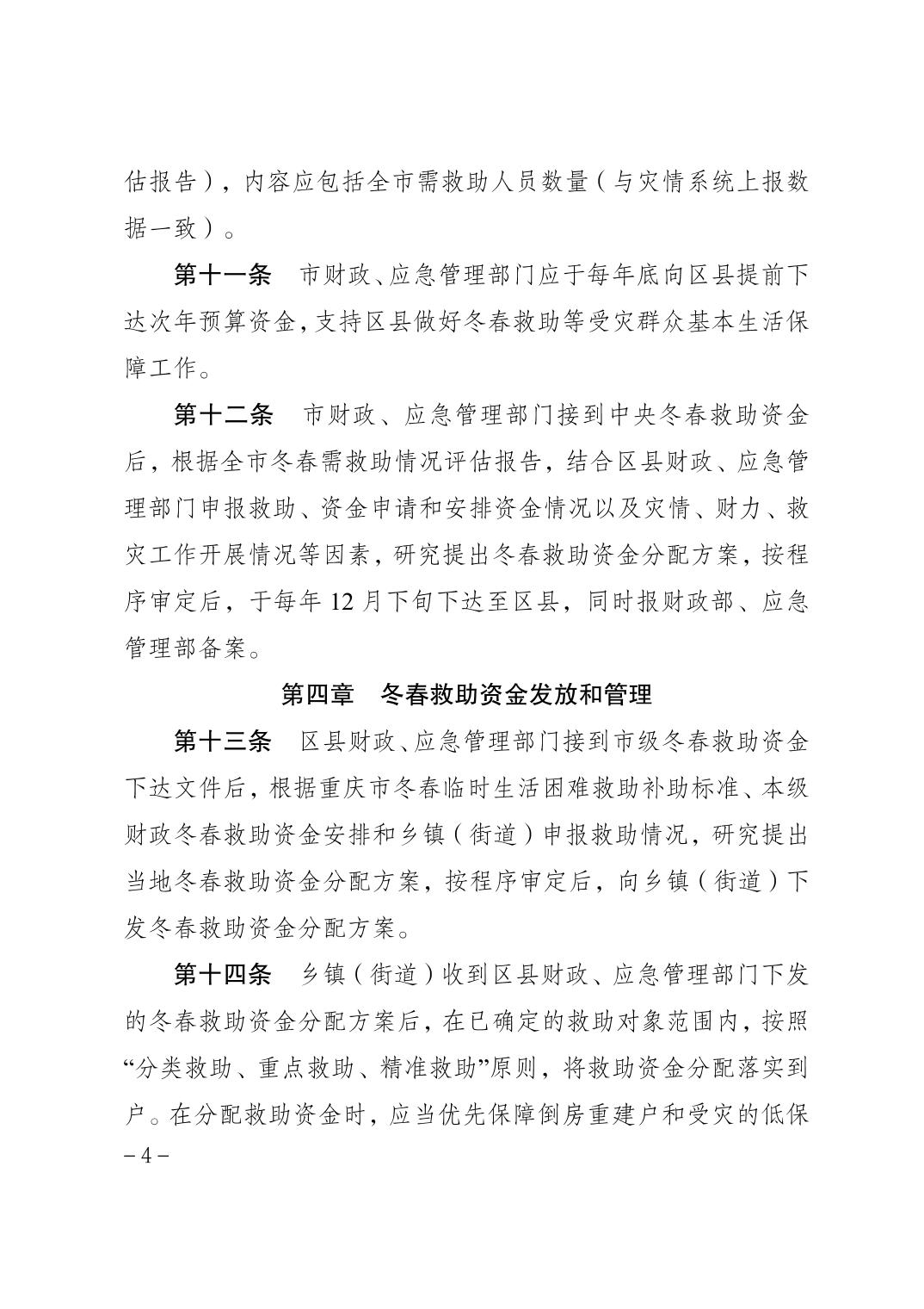 | 標題 | 重慶市應急管理局 重慶市財政局關于印發重慶市受災人員冬春生活救助工作辦法(試行)的通知 |
