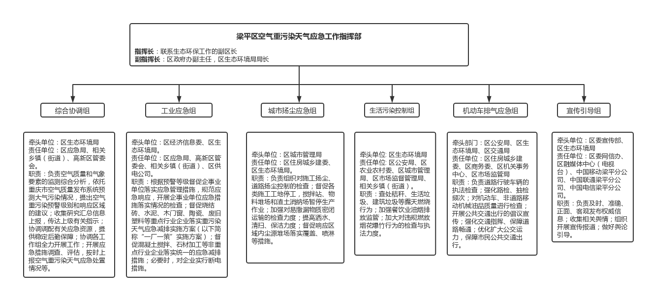 區(qū)指揮部下設(shè)綜合協(xié)調(diào)組、工業(yè)應(yīng)急組、城市揚(yáng)塵應(yīng)急組、生活污染控制組、機(jī)動(dòng)車排氣應(yīng)急組和宣傳引導(dǎo)組,組織開展應(yīng)急響應(yīng)工作。