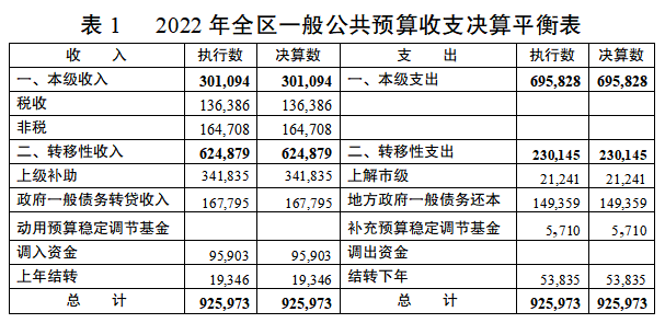 2022年全區一般公共預算收入調整預算數301,094萬元,決算數301,094萬元,為調整預算的100.0%,增長10.8%。一般公共預算收入加上級補助341,835萬元、地方政府一般債務轉貸收入167,795萬元、政府性基金和國有資本經營預算調入95,903萬元、上年結轉19,346萬元,減上解支出21,241萬元、地方政府一般債券轉貸還本149,359萬元,可用財力為755,373萬元。支出為695,828萬元,為調整預算的100%。補充預算穩定調節基金5,710萬元,結轉下年53,835萬元。